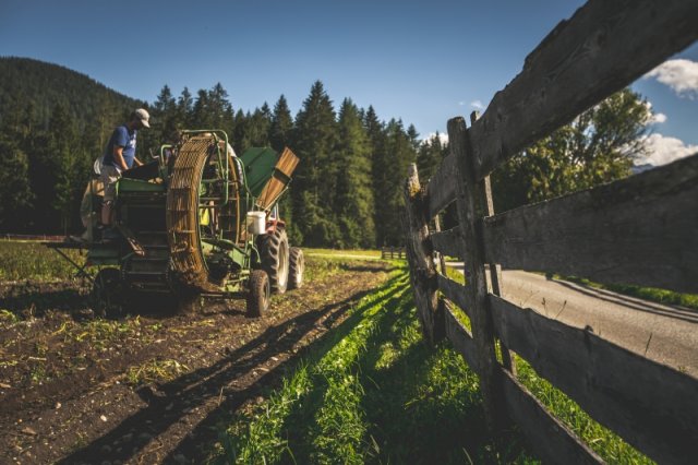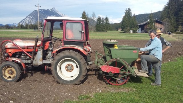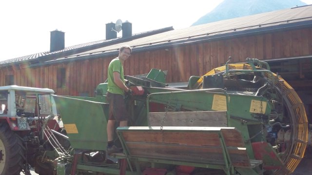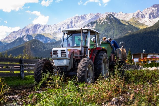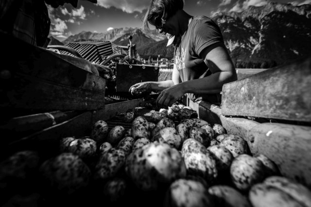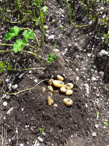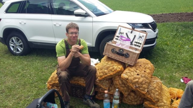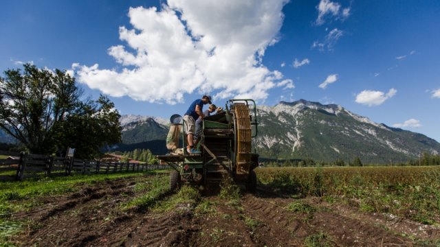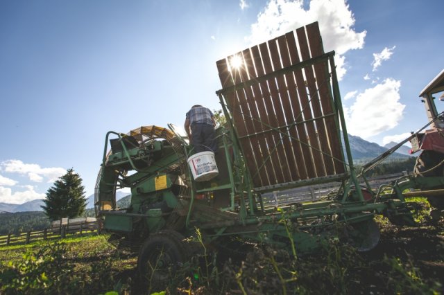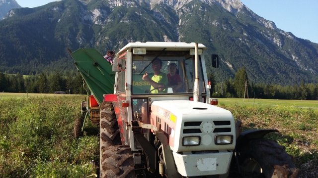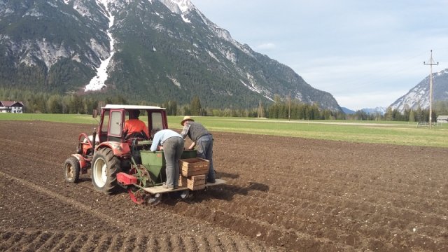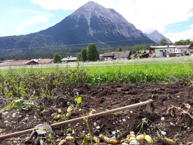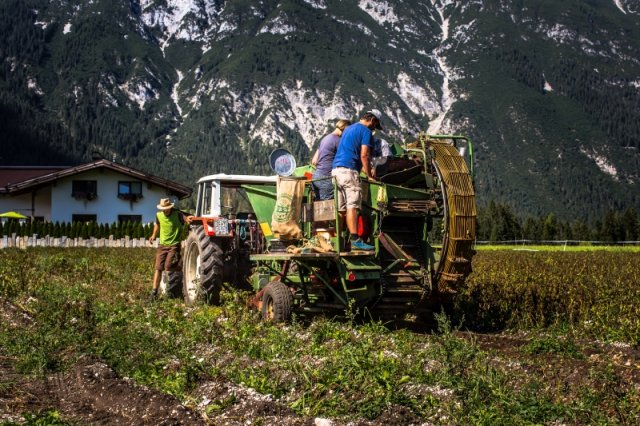 Unsere Saatkartoffeln sind entweder direkt von uns oder von der Saatbau-Genossenschaft in Kematen. Im Frühsommer werden die Kartoffeln in den Acker gelegt und durch eine Überfahrt mit dem Striegel von kleinen Beikräutern freigehalten. Ab dem Zeitpunkt wo die Kartoffelpflanze die Oberfläche durchbricht ist schon mal einiges geschafft. Die Pflanze nutzt die Sonnenstrahlen um genug Energie für die Fortpflanzung zu erhalten. Sobald die Pflanzen etwas größer sind geht es bei uns an die Handarbeit. Das heißt die Kartoffeln werden "gepeckt". Das bedeutet nichts anderes als jedes einzelne Kartoffelpflänzchen per Hand von Beikraut zu befreien. Wieso macht man das? Ganz einfach - die Beikräuter würden den Kartoffeln zu viel Nährstoffe und Licht nehmen und dadurch wäre der Wachstum geschwächt. Unsere schönen Kartoffelstauden gefallen nicht nur uns, sondern blöderweise auch dem Kartoffelkäfer. Bisher haben wir es immer geschafft diesen in stundenlanger Arbeit täglich einfach mit unseren Händen abzuernten - keine schöne Arbeit. Wir verwenden keinerlei Insektizide zur Bekämpfung! Wir versuchen die Pflanzen zu stärken, dadurch schaffen es einige sich selbst gegen den Käfer zu wehren.