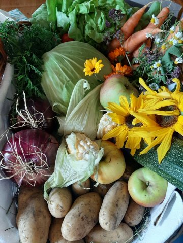 Unsere Gemüsekisten gibt es in der Erntesaison jeden Freitag im Hofladen auf Vorbestellung.