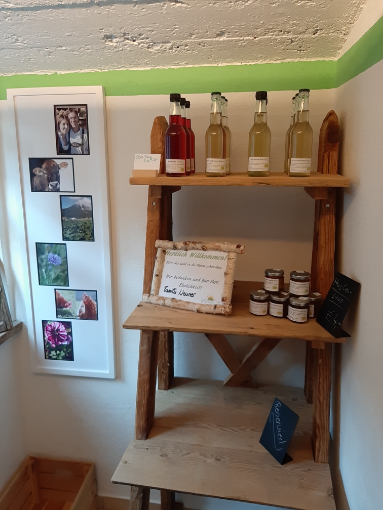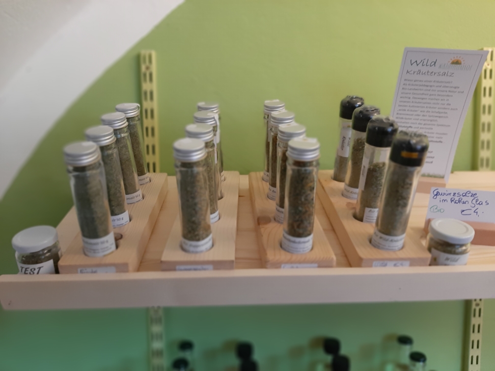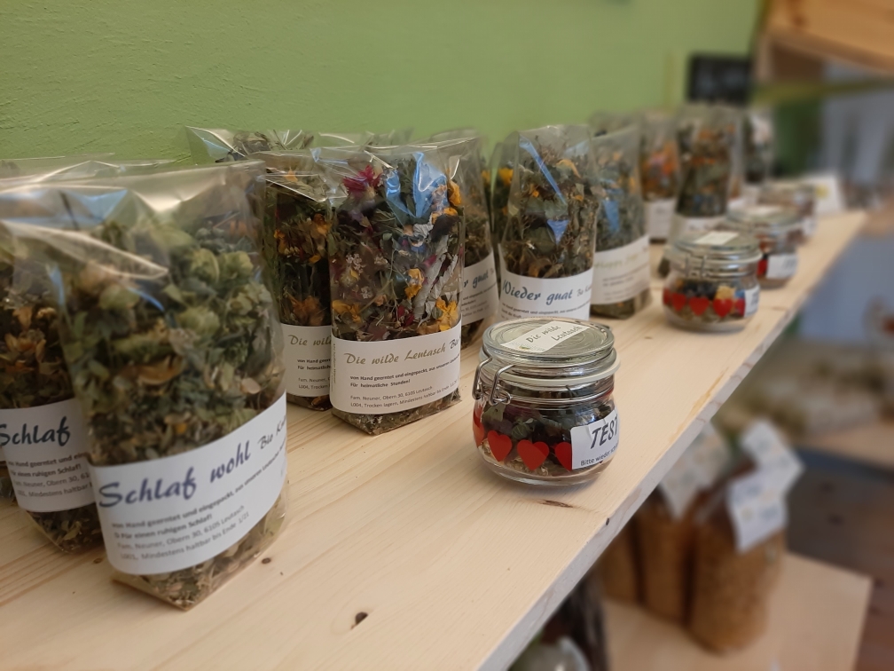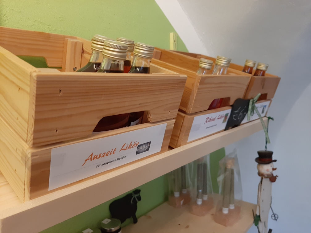 Alle Produkte wurden mit Liebe per Hand gefertigt. Die Kräuterprodukte stammen natürlich aus eigenem BIO-Anbau von unserem Kräutergarten. Gerne können Sie diesen auch besichtigen. Die Eier stammen natürlich von unseren Hühnern und die Kartoffeln von unseren Feldern. Es gibt auch verschiedene Sirupe wie Holunder-, Apfelminze oder Malvensirup.