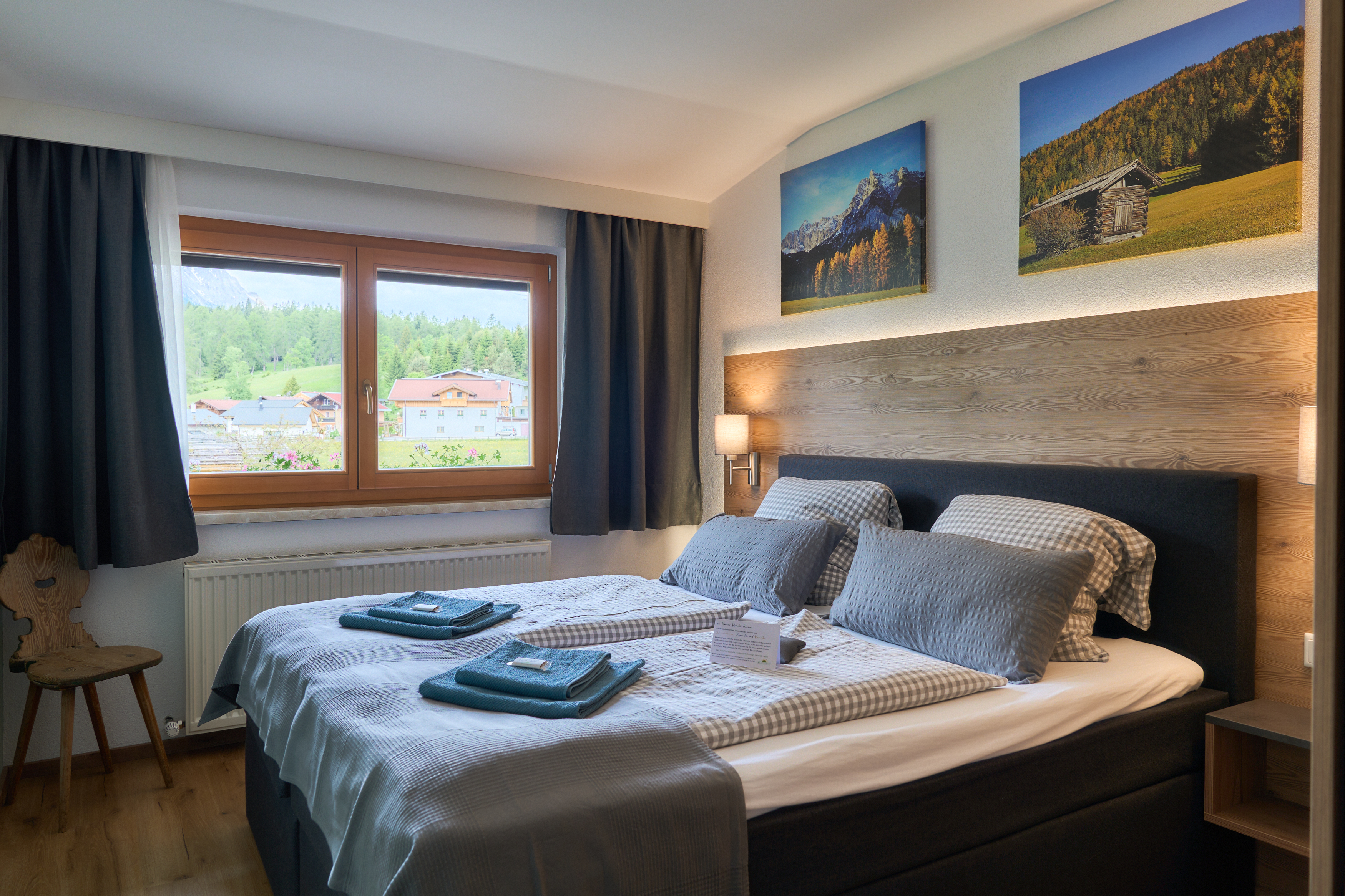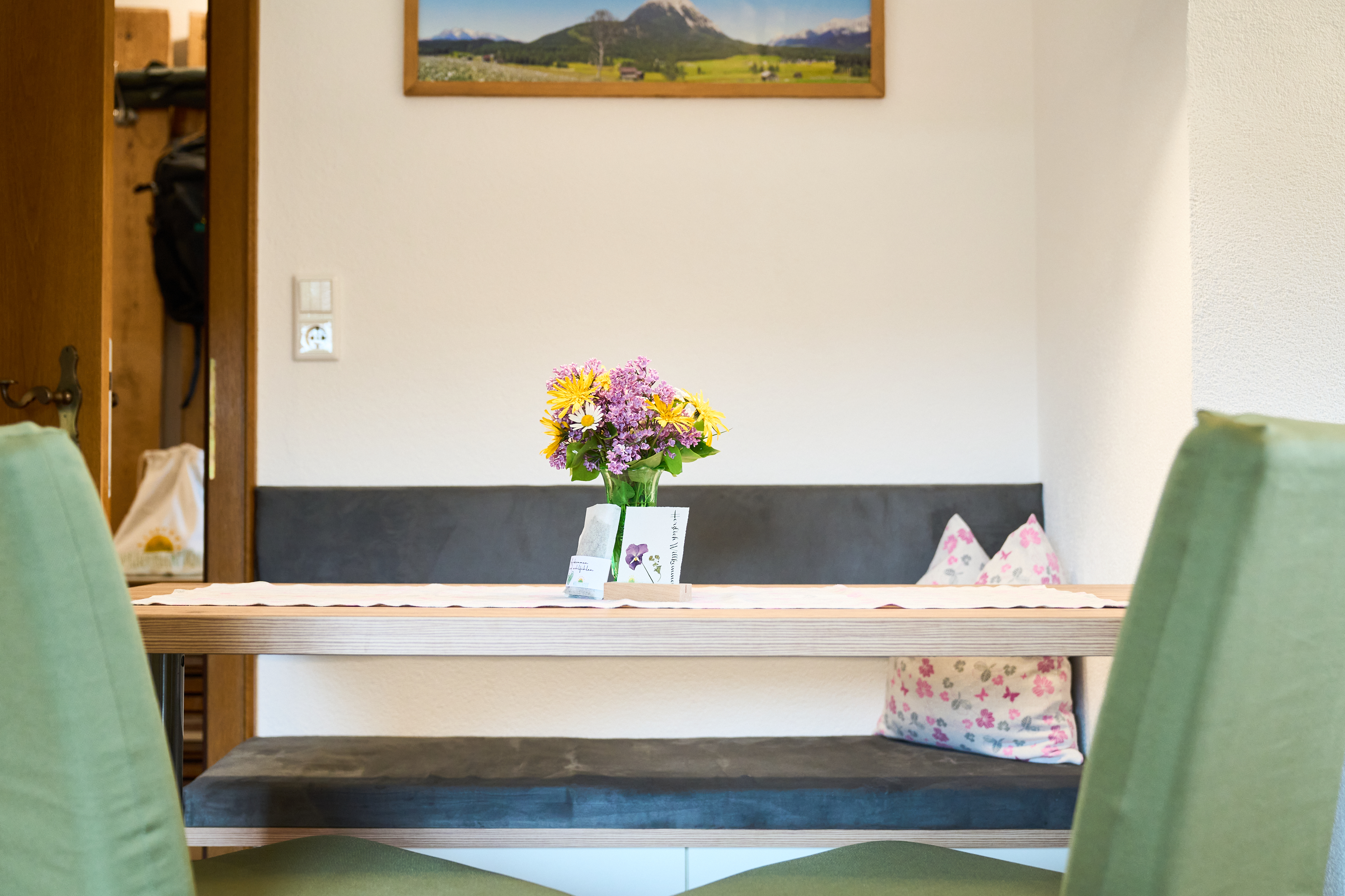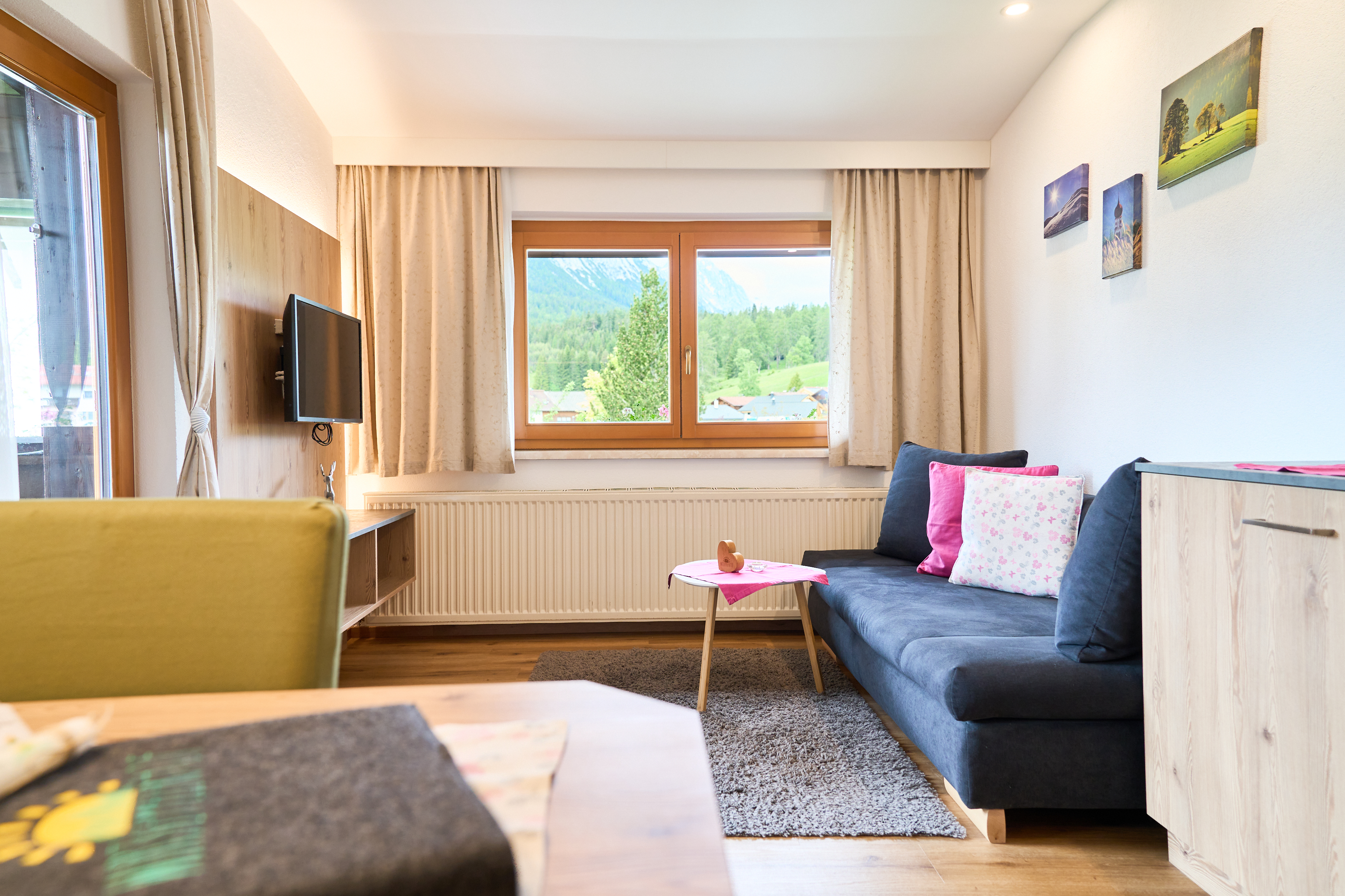 Die Ferienwohnung Hohe Munde besteht aus einem Wohnzimmer mit TV (mit Schlafcouch) und Koch-Nische mit Geschirrspüler, einem separaten Schlafzimmer, einem Bad mit Dusche und einem Balkon. Am Balkon (Richtung Süden u. Westen) können Sie nach einer Langlauf- oder Wandertour die Aussicht genießen. Ein Frühstück am Balkon bietet sich bei diesem tollen Ausblick natürlich auch sehr an.